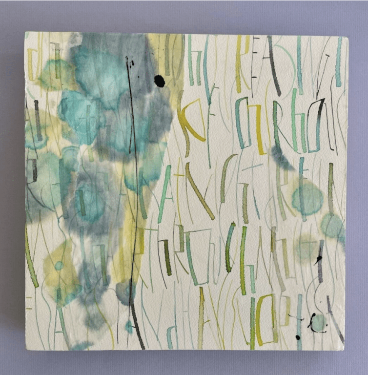 Colour blended writing and rice paper collage mounted on a cradle.